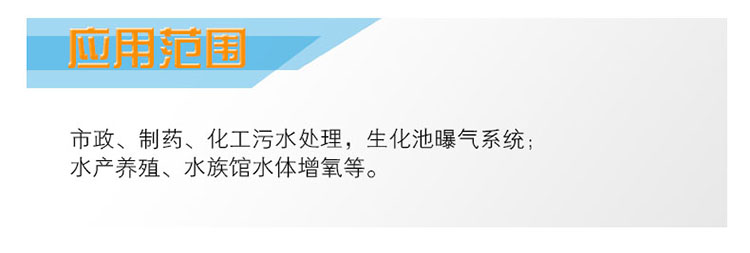 應用范圍:市政、制藥、化工污水處理,生化池曝氣系統;水產養殖、水族館水體增氧等。