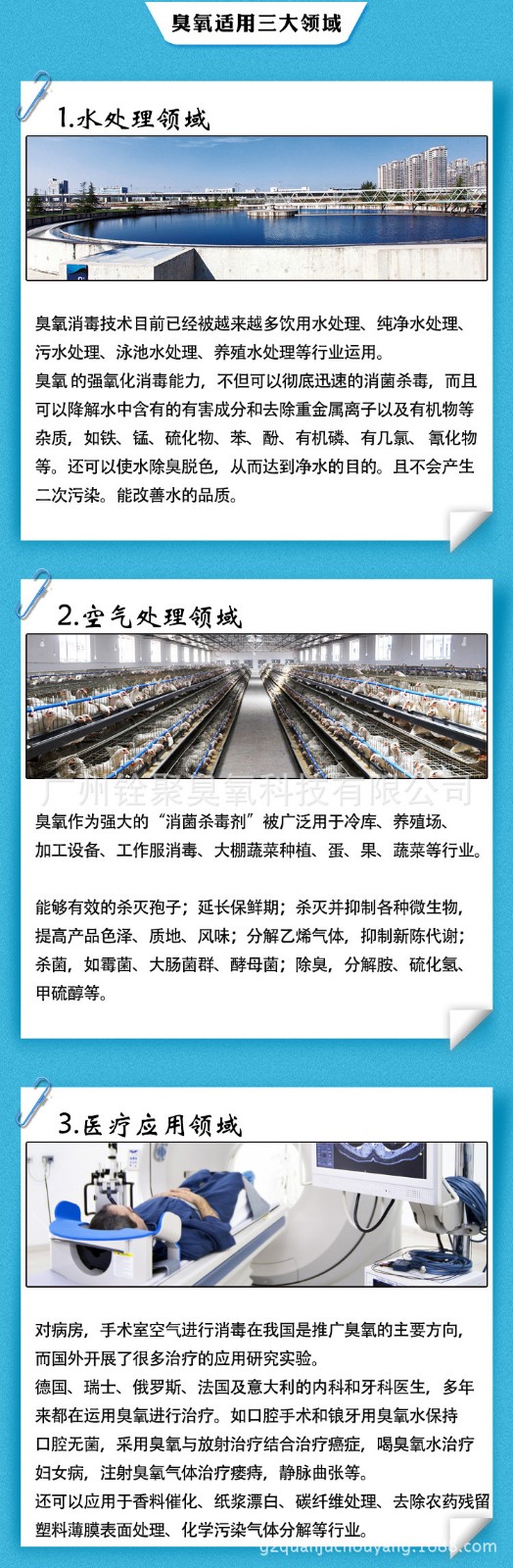1、水處理凈化,對各類直飲水、商用水、自來水、生產用水等進行消毒殺菌處理,同時還能降解各類有害物質。如礦泉水、純凈水、飲料用水、化妝品廠用水、藥品用水都要使用到臭氧來進行處理,其環保、高效、徹底。